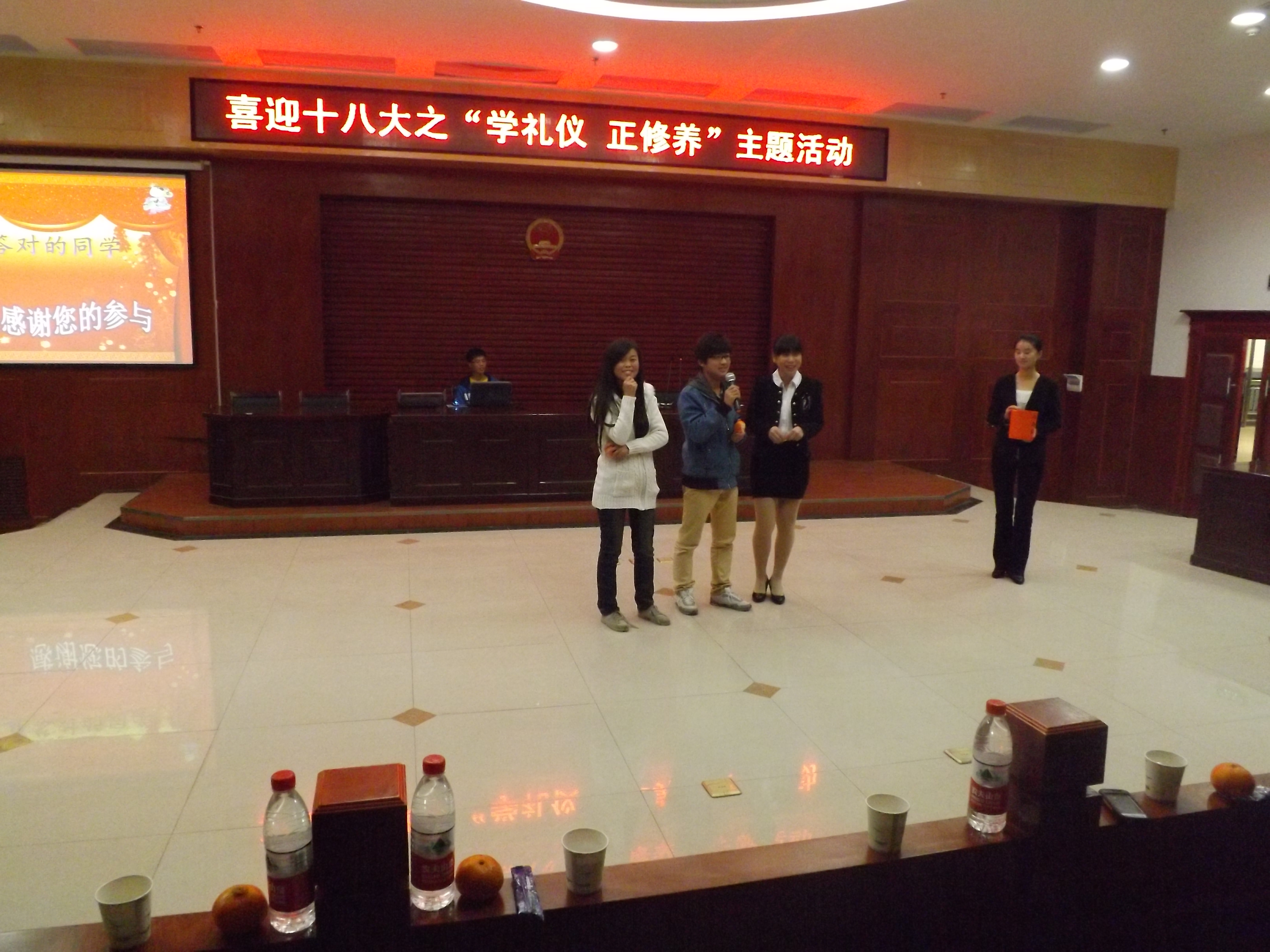 喜迎十八大,礼仪正修养。为了庆祝十八大的顺利召开,全面提升学生的思想道德素质和文明礼仪素养,11月10日晚,法学院在模拟法庭举办了喜迎十八大之第三届“学礼仪 正修养”主题活动。法学院团委书记华锋应邀出席,法学院2012级同学积极参与。