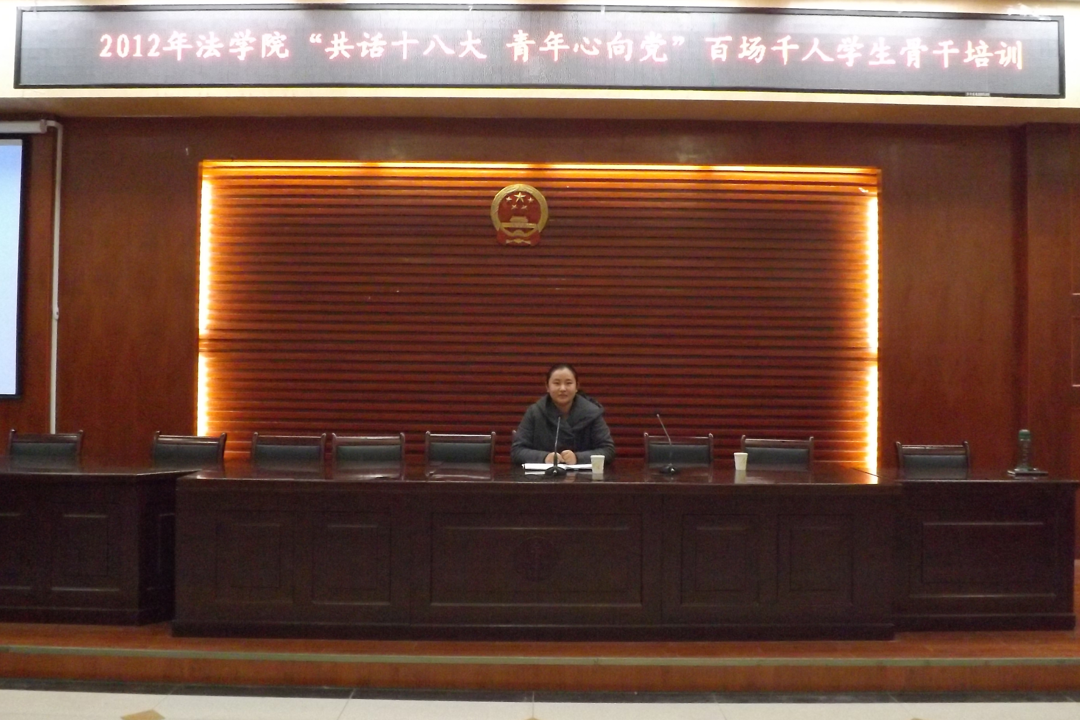 为了提高学生骨干对学生干部的定位和认识,培养出一支高素质,高能力的学生干部队伍,12月12日,法学院于模拟法庭成功举办了“共话十八大,青年心向党”百场千人学生骨干培训会第四场。法学院09级辅导员茹祥莉老师任主讲,法学院全体学生干部聆听了此次讲座。