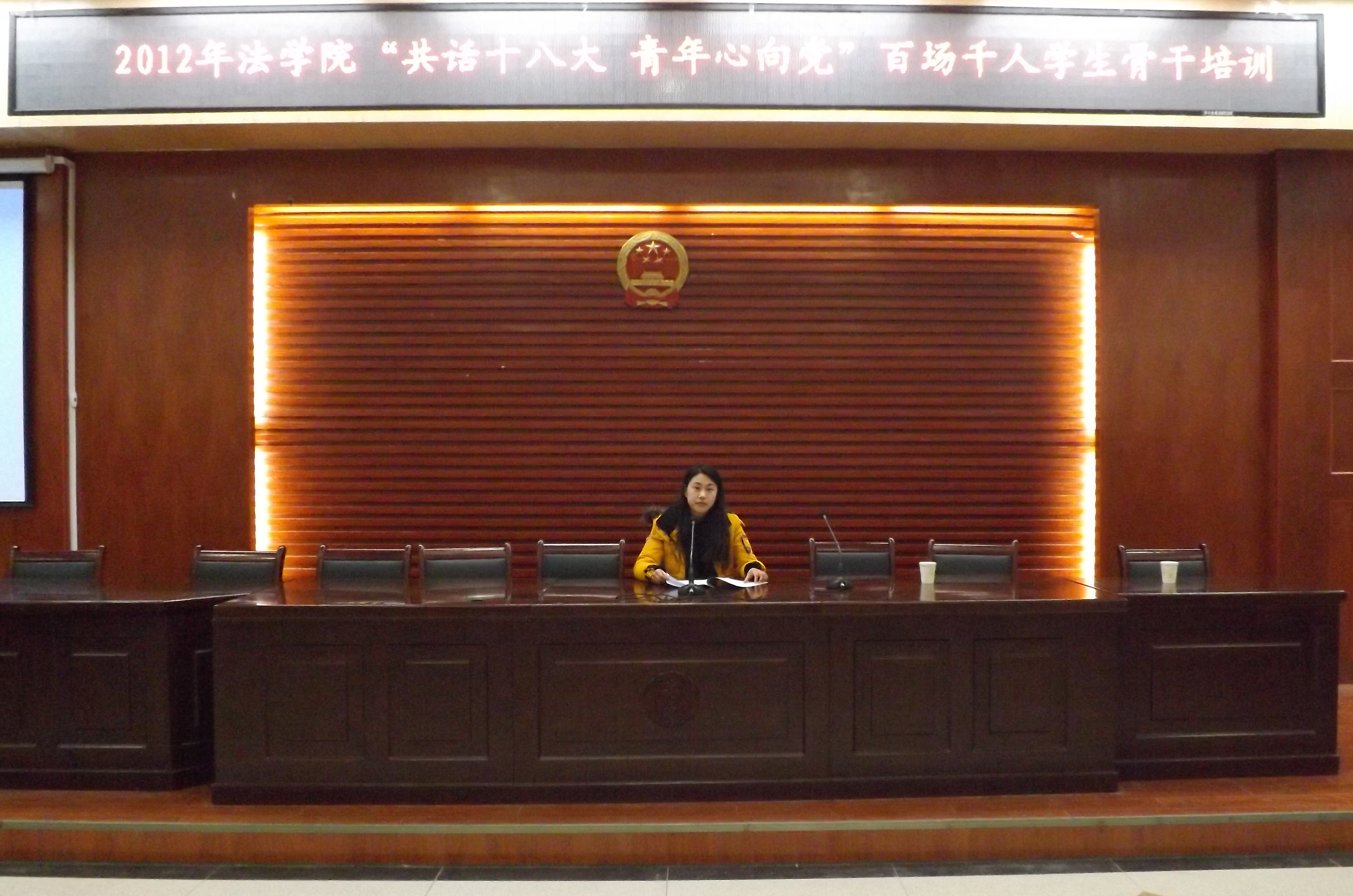 为学习十八大精神,增加同学们对党员的认识,提高入党积极性,12月13日,法学院于东区模拟法庭成功举办了“共话十八大,青年心向党”百场千人学生骨干培训系列活动之发挥党员、学生骨干先锋模范作用专题讲座。讲座由法学院团委书记、12级辅导员华锋主持,11级辅导员左红娟担任主讲。 讲座伊始,华锋老师首先介绍了十八大全新提出的理论热点,分享了其心得和体会,并强调,大学生、学生骨干入党的积极意义。随后,讲座正式开始,左红娟老师主要从“大学生党员的意义”,“学生党员发展的主要程序”和“如何发挥党员、学生骨干先锋模范作用”三个方面来讲解。她首先介绍了党员的概念,入党的基本要求和大学生党员的作用。接着,她指出,学生骨干作为学生群体的佼佼者,是引领广大学生奋发图强、积极投身建设的带头人,应该坚定政治路线,处处发展先进性,积极向党组织靠拢,并详细介绍了党员的发展程序,同学们具体应该怎样做。最后,老师再次强调了大学生应该处处发扬先锋模范作用,时时以“四有”的标准来要求自己,为社会主义建设贡献自己的力量。讲座后,老师还热情的接受同学的提问,并给出了详细的答案,赢得了同学们的一致好评。 本次讲座旨在加强学生骨干对党员的了解,加深了学生干部对十八大精神的了解,为其更好地开展工作提供了科学的的理论指导。同时,促使学生干部积极关注国家时政,践行党的先进理念,明确方向目标,使其铭记学生干部的使命,积极进取,对于提高学生干部的先进性有重要作用。 (法学院 华锋 赵丹 李杨)