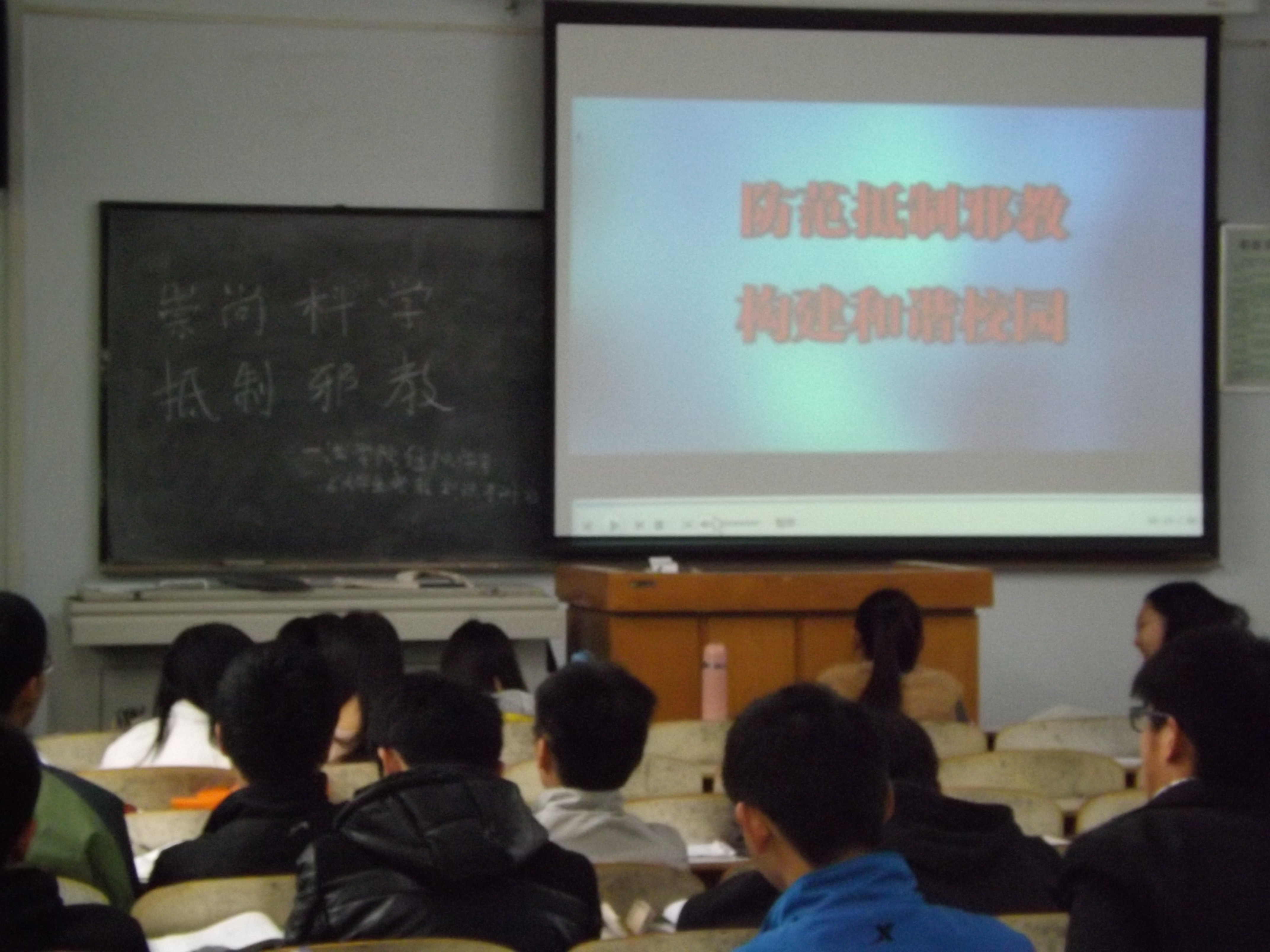 活动伊始,马老师向大家播放了反邪教警示教育视频,教育大家要把握校园文化价值导向,防范抵制非法宗教活动,确保大学生宗教信仰状况不至偏离正常轨道。紧接着,马老师就马克思宗教观、党的宗教政策以及我国相关的宗教法律法规向大家做了讲解,并发表讲话:要求大家积极组织各种宗教知识学习活动,以强化大学生马克思主义世界观、人生观、价值观和宗教观教育。最后,马老师宣读了宗教的相关规定,即中国共产党明确规定:共产党员不得信仰宗教,不得参与宗教活动。《团章》规定,共青团员是党的助手和后备军,不得信仰宗教和参加宗教活动,学生党员和共青团员要树立辩证唯物主义和历史唯物主义的世界观,不信教,不传教。至此,本次宗教知识学习活动圆满结束。