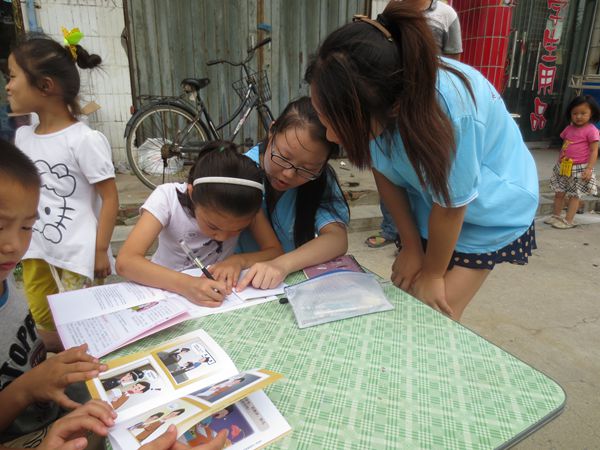 志愿服务队分为两组,对当地的留守儿童进行认真细致的辅导。有的队员从暑假作业入手,查看对错,在作业规划上给予建议;有的队员则先了解现在的小学生的学习难易度、学生现在成绩等,然后就如何提升成绩给出意见。在辅导过程中有一个孩子,名叫朱子润,上小学二年级。孩子说:“爸爸妈妈白天都上班去了,家里只有奶奶和我,有时候写作业,都有好多不会写的.”这些农村的孩子大多都是父母长期在外地打工,只有爷爷奶奶在家里教育他们,很多时候孩子的作业辅导成了问题。并且在缺乏教导的情况下,很难形成正确的人生观、价值观。志愿服务队的队员们对孩子细心、耐心地教孩子写作业,让他们得到帮助的同时,也感受到社会的温暖。