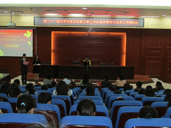 为深入贯彻落实两会精神,践行党的群众路线教育,提升我校大学生的基本技能和综合素质,展示了新时代师大学子的青春风采,繁荣校园文化,法学院于2014年4月27日下午两点半,在河南师范大学党委学生工作部、学生处的指导下成功举办了以“学在师大,绽放青春”为主题的双语演讲赛之英文预赛B组的比赛。出席本次比赛的评委有来自外国语学院的赵攀老师、徐瑾老师、陈宁宁老师、孙静老师、杨密老师,嘉宾有校学生处、思想教育科科长张永富老师、法学院团委书记兼2012级辅导员马淑明、法学院2013级辅导员康东书。