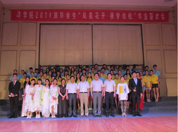 5月30日晚,帕瓦罗蒂音乐厅热闹非凡、真情涌动,夏花绚烂,灯火辉煌。由法学院2010级主办的2014届毕业生毕业晚会在这里隆重举行。晚会以“凤凰花开 携梦远航”为主题,法学院党总支书记张银付,法学院副院长华锋,教师代表张荣现、于庆生、李佳勋,院党总支秘书、2010级辅导员刘静,院研究生秘书、2011级辅导员左红娟,院团委书记、2012级辅导员马淑明出席了本次毕业联欢会,近500名学生共同观看了此次联欢会。联欢会充满激动与惊喜,离别与感恩,现场气氛热烈而又情谊浓浓。师生们奉上了自编自演的精彩节目。