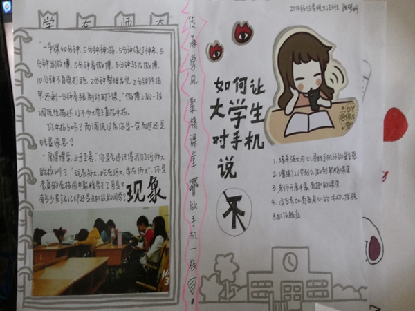 在本次大赛中,法学院14级新生们表现出了极高的主动性与创造性,上交作品数量多,而且在上交作品中涌现出了许多优秀作品。同学们心思独特,想法新颖,很好地表现了本次活动的主题——“传承学风,聚精课堂,不做手机族”,用图画阐释了长期玩手机的危害,如长期玩手机不仅容易导致脊椎变形,而且还会影响视力,以此倡导大家放下手机主动学习,用自己一度沉迷的双眼发现生活点滴的美好,拥抱自然,感受真实的生活。在活动后期,学院将优秀作品拍照,传至法学院官方微博,扩大了优秀作品的影响力。