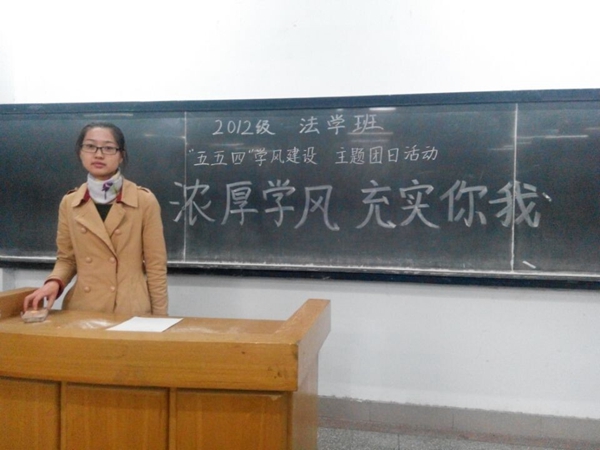 为响应校团委关于实施“五五四”学风建设计划的号召,促进形成更加优良的学风,11月9日下午,2012级法学班在阶梯楼101教室开展“浓厚学风 充实你我”的主题团日活动。法学院团委书记、2012级辅导员马淑明应邀参加此次活动。