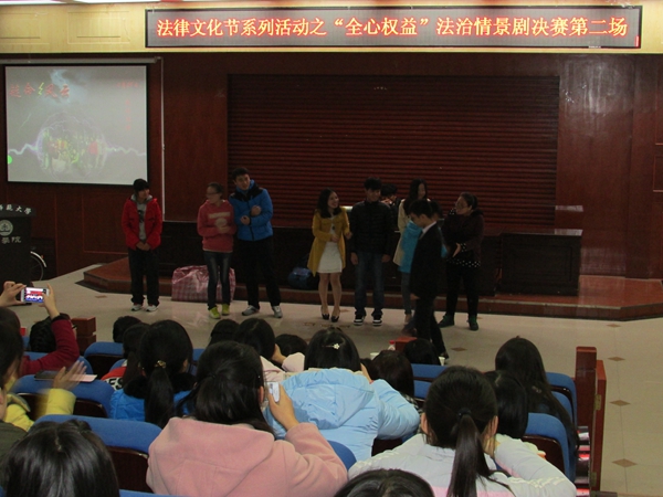 由我校党委学工部、普法办主办,法学院大学生法律援助中心承办的法律文化节系列活动之“全心权益”法治情景剧经过两场半决赛最终于11月28日晚在模拟法庭圆满落幕。各学院10名参赛选手挺进决赛,法学院研究生工作秘书兼2011级辅导员左红娟,法学院2013级辅导员康东书担任评委,各学院学生代表参与观看了比赛。