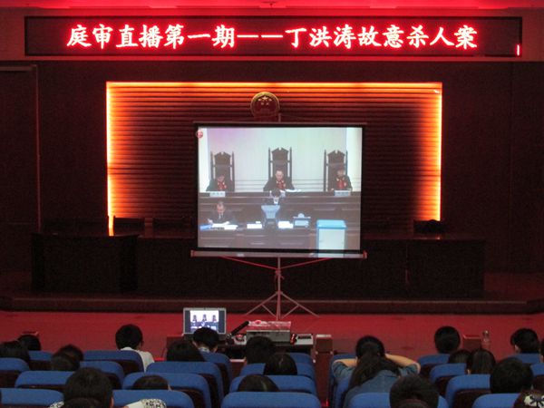 由主持人介绍了基本案情后,庭审视频开始播放,同学们为法庭庄重严肃的氛围所感染,都聚精会神的观看并思考着。庭审经历了书记员宣布法庭纪律,检查官宣读一审判决书,上诉人做上诉报告及上诉理由,询问上诉人对检查官所呈证据是否有异议,然后辩护人及检查官就判决提出了自己的观点,由检查官呈上证据和有关证人,后被告及其辩护人展开辩护,检查官发表看法,审判长宣读本院宣判委员会的讨论结果等程序,最后法庭依据《中华人民共和国刑法》判决丁洪涛故意杀人罪,判处死刑,剥夺政治权利终身。