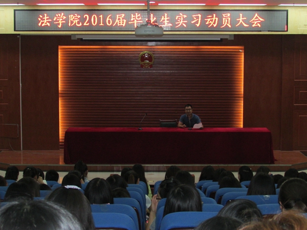 以昂扬激情,踏实习征程。9月7日下午,我院于模拟法庭举行了2016届毕业生实习动员大会。我院教学秘书胡光老师,2012级辅导员马淑明,2012级全体学生参与此次大会。