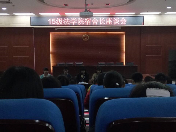 为了提高学生在寝室文明方面的认识,促进寝室文化的建设,10月24日下午,法学院自律委在东区模拟法庭举行宿舍长座谈会,法学院自律委成员以及2015级全体宿舍长到场参加。