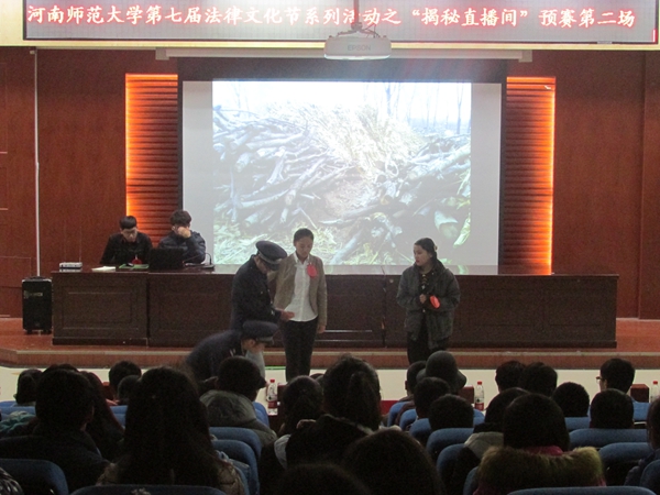 为提高同学们的法律素养,法学院法律服务部于25号下午在模拟法庭举行了河南师范大学法律文化节系列活动之“揭秘直播间”预赛第二场,法学院2012级兼职辅导员马亚伟和部分学院的学生会主席作为评委出席了本次活动,七个学院的部分学生参加了本次活动。