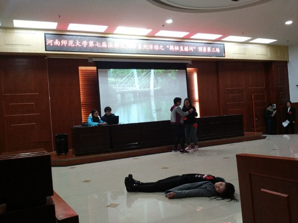 河南师范大学法律文化节活动如火如荼地展开。25日晚,法学院法律服务部在模拟法庭举行了法律文化节系列活动之“揭秘直播间”预赛第三场,活动邀来法学院副教授赵宁及参赛学院学生会副主席作为评委嘉宾,参赛各院的部分学生参加了此次活动。
