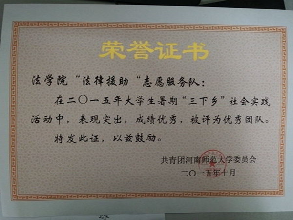 近期,校暑期“三下乡”社会实践优秀团队评选活动圆满落下帷幕,法学院“法律援助”志愿服务队在2015年校暑期“三下乡”社会实践中因成绩突出,表现优异,被评为校级优秀团队。