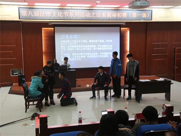活动前期,各院便踊跃报名并积极排演,做好了各项赛前准备工作。活动采取PPT展示和情景剧演绎相结合的方式进行,首先各院通过ppt来介绍自己的院系,同时配合简单的选手介绍,随后各组揭秘者和表演者依次上台带领大家探寻还原所述案件的全过程。各院的风格迥异,形式上采取今日说法、小撒说法等模式,内容上与各自学院特色相配合,包含有家庭暴力、侵犯消费者权益、拐卖妇女等各类案件。跌宕起伏的案情配以惟妙惟肖的表演,展现出各院代表队默契的团队合作和高超的演技。理性缜密的描述辅以反常规的思维模式,发人深省,启人深思,赢得在座同学的阵阵喝彩。最后,韩老师点评指出,此次活动所涉案件关注社会生活,反映社会公平正义,而法律作为一种社会规范与生活、正义密切相关,所以同学们应当增强对法与程序的理解,学法懂法守法用法,为推动社会法治化进程贡献自己的力量。