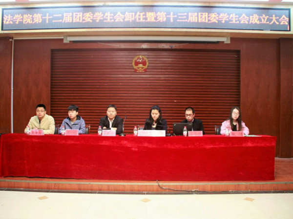 闲云潭影日悠悠,物换星移几度秋。3月26日上午,法学院于模拟法庭召开第十二届团委学生会卸任暨第十三届团委学生会成立大会。法学院党委副书记葛照金、团委书记马淑明、各年级兼职辅导员及全体团委学生会干部参加了本次大会。会议由马淑明主持。