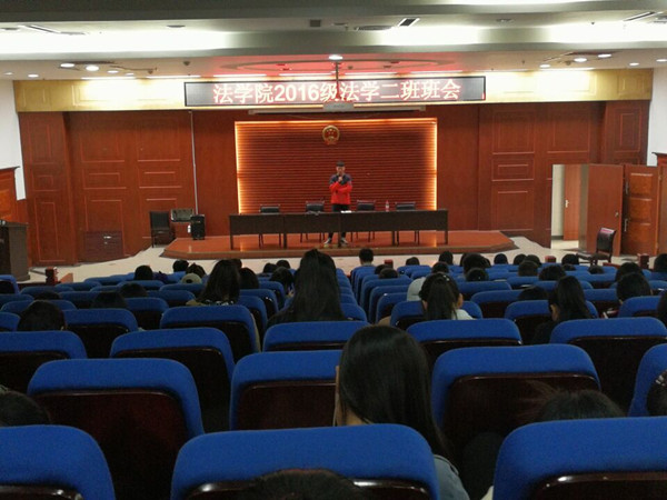 为了提高法学二班全体同学学习的主动性和参加活动的积极性,4月11日下午,法学院2016级法学二班在模拟法庭举行班会,全班同学参加了此次班会。