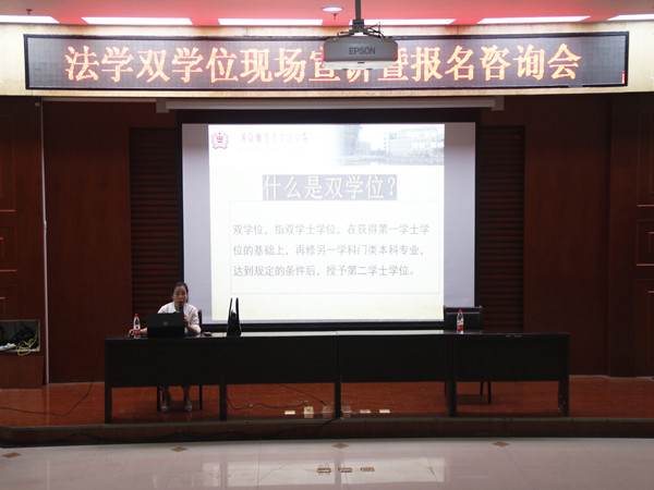 为给学有余力的学生提供丰富知识、拓展视野的平台,5月16日下午,法学院在模拟法庭举办法学双学位现场宣讲暨报名咨询会,法学院教研室主任王晓慧应邀担任本次会议的主讲人。我校有意选报法学双学位学生参加此次咨询会。