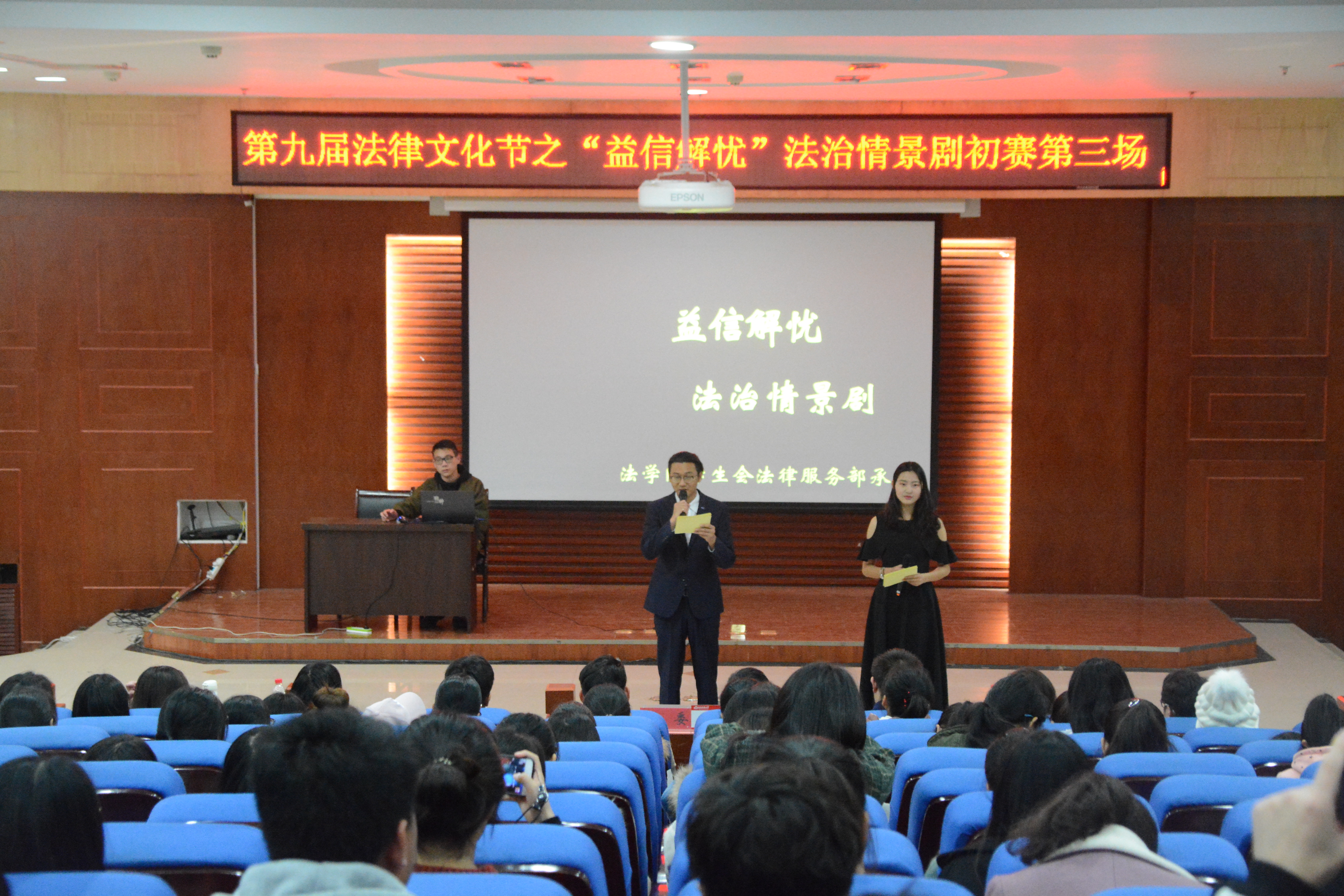 为了宣传法律法规,增强同学们的法律意识,法学院法律服务部于11月24日到11月26日开展了以“益信解忧”为主题的法制情景剧活动。四川大学与行政法学博士张明涛、郑州大学法学博士郭少飞、河南师范大学法学院办公室主任曾凡伟、2015级兼职辅导员杨毅斌以及各个学院的部分同学参加了此次活动。