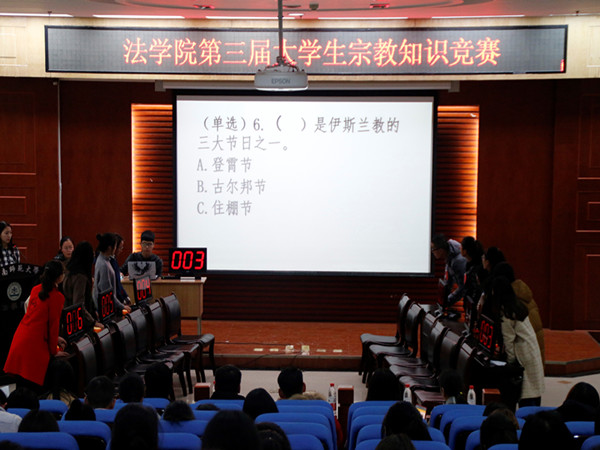 为增加学生对宗教文化知识的了解,培养当代大学生的马克思主义宗教观,在校园内形成“认识宗教,崇尚科学”的良好氛围,法学院团委组织部于11月19日下午三时在模拟法庭举办了法学院第三届大学生宗教知识竞赛,同学们热情高涨,积极参加。