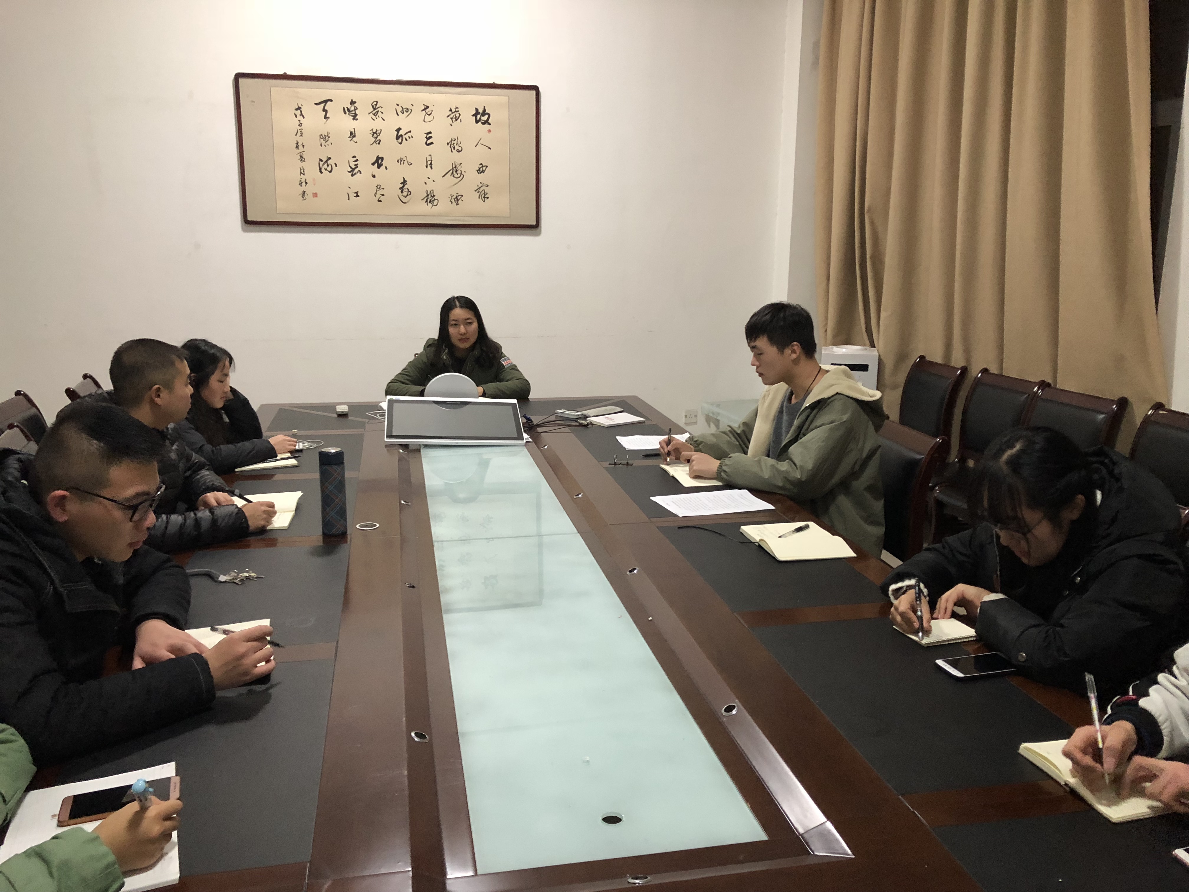 班委会由班长南佳艺主持。会议伊始,南佳艺对近期班级考核成绩表示肯定,同学们上课的积极性和学习的热情有很大的提高,她由衷的希望班级学习氛围可以继续保持良好。其次,南佳艺对近期比赛活动作出安排,她指出,“乒乓球比赛”“班主任经验交流会”“元旦晚会”等一系列的活动既可以缓解同学们近期繁重学习的压力,也是展示个人才艺和表现班级风采的绝佳机会,班委们要提高同学们参加活动的积极性。随后,各个班委对活动提出建议,共同修改不足之处。最后,南佳艺希望班委们在班级中做好先锋表率作用,带动同学们学习热情,促进班级内整体学风建设。