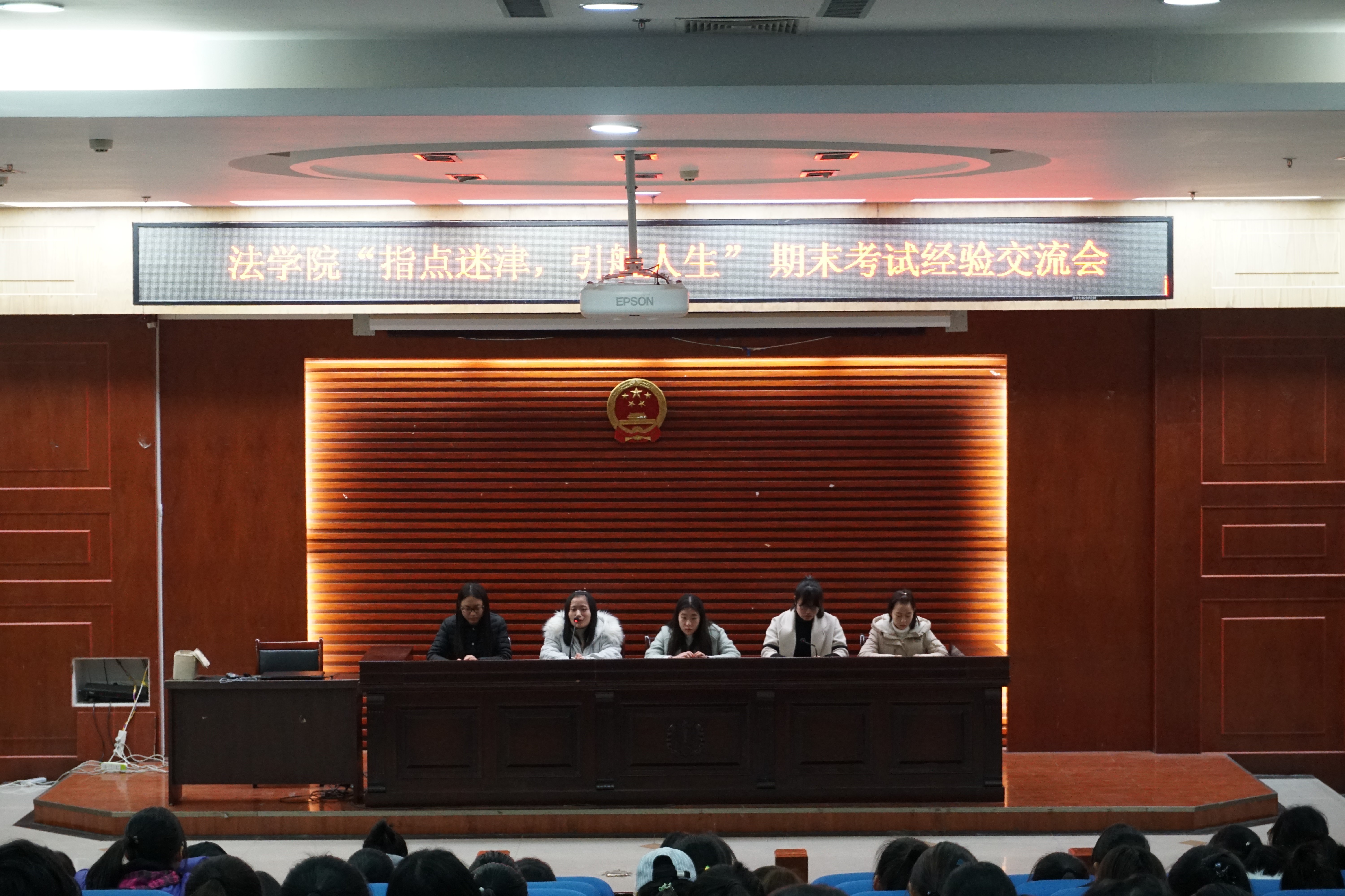 在期末考试即将来临之际,为了帮助2017级新生更好的了解考试情况,缓解考前压力,在备考中把握方向,提高效率。12月26日晚,由学习部承办的“指点迷津 引航人生”期末考试经验交流会在模拟法庭展开,法学院2017级全体同学参与活动。