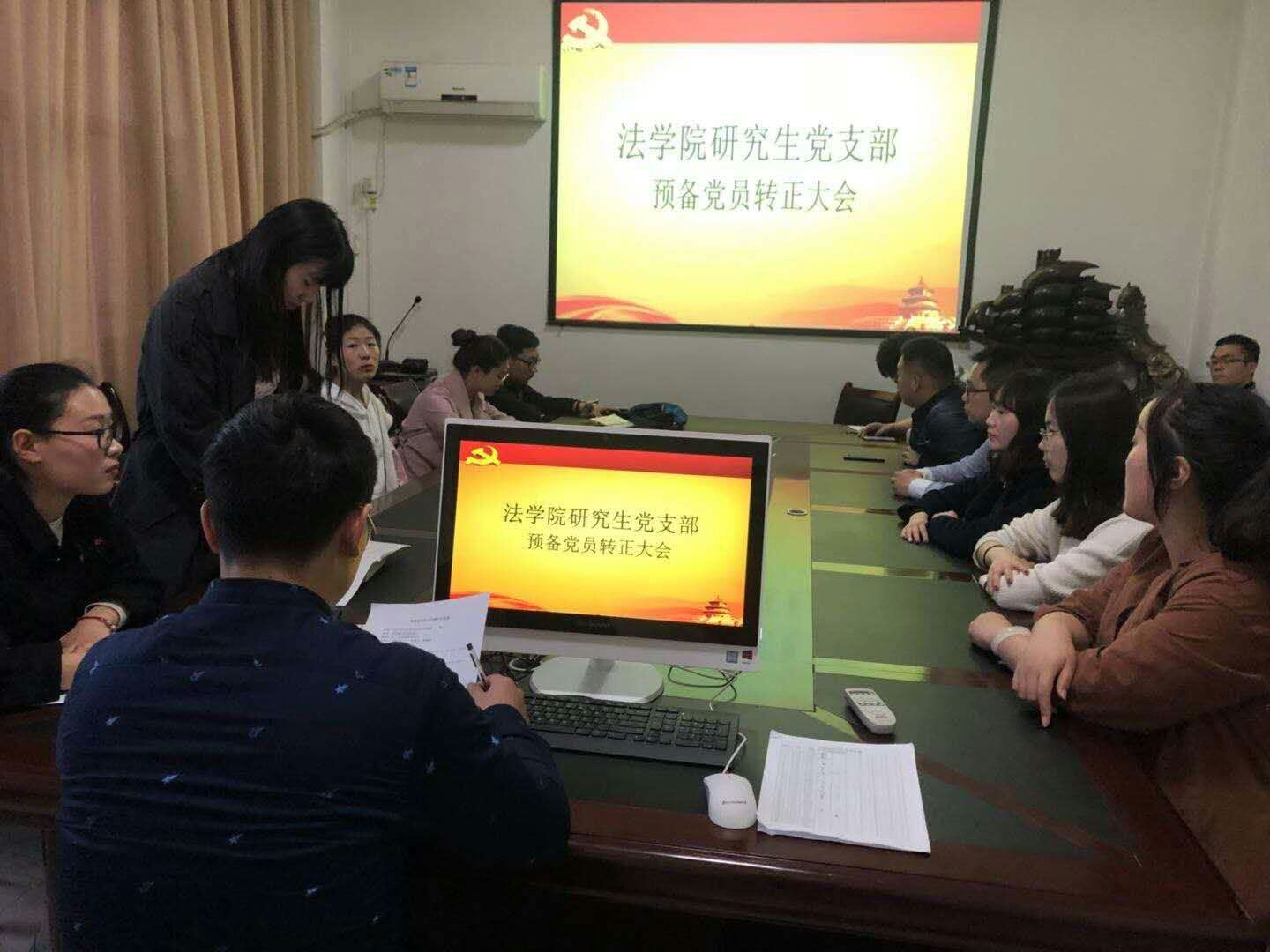 2018年3月27日下午,法学院研究生党支部在崇法楼302会议室举行关于预备党员转正大会。会议由党支部书记左红娟同志主持,组织委员宋倩楠同志记录,支部与会中共正式党员25名。