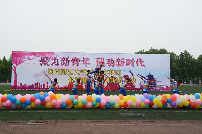 聚力新青年,建功新时代。5月6日下午,由共青团河南师范大学委员会、河南师范大学学生会主办的2018年校园健身健美操、啦啦操大赛在西区操场举行。