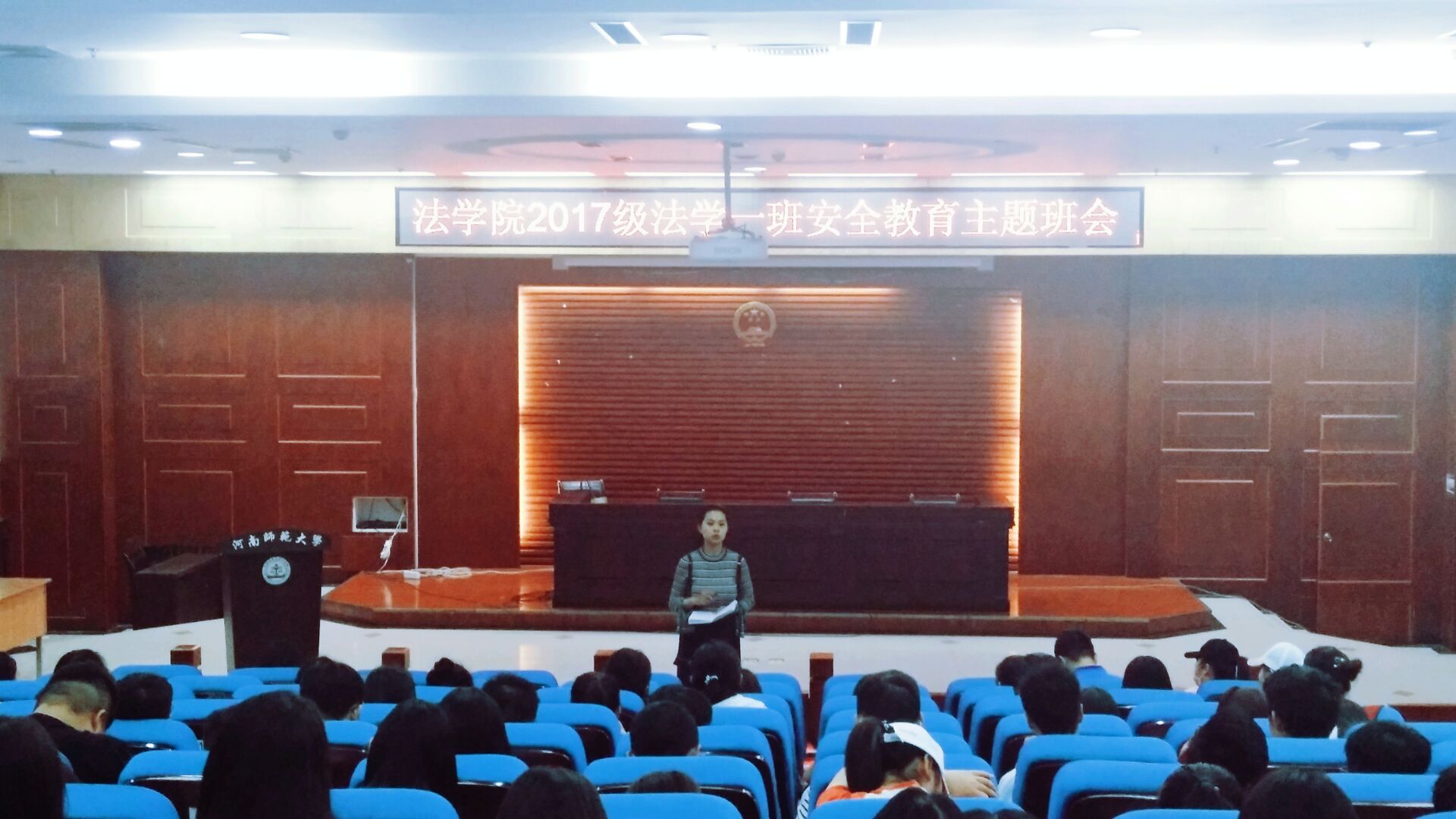 为提升同学们的安全意识,切实加强校园安全教育。5月10日上午,2017级法学一班于模拟法庭召开安全教育主题班会,辅导员康东书与兼职辅导员郝梦臣参与此次会议。法学一班全体同学到场。