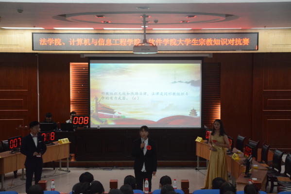 为深化青年大学生对宗教历史发展理论意义和现实意义的认识,把握新形势下党关于宗教问题的走向,11月7日,由法学院、计算机与信息工程学院、软件学院组织的大学生宗教知识对抗赛在模拟法庭举行。法学院团委书记马淑明、计算机与信息工程学院敦洁老师、软件学院李淳老师及百余名学生共同参与此次竞赛。
