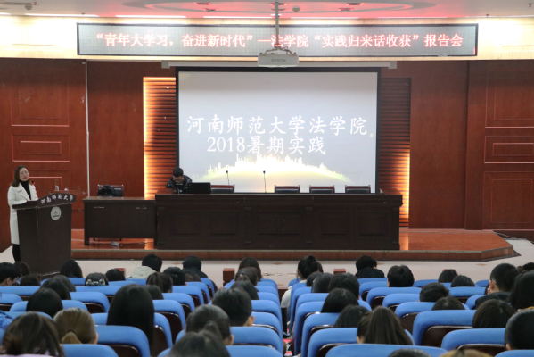 本次暑期实践总结报告会由实践团队介绍、先进个人分享、老师点评指导三个环节构成。首先,“心匙之家·用爱筑梦”实践调研团队长李子俊为我们介绍了其团队在原阳县阿香梁寨小学开展的调研学习活动,调研团在游戏与课堂中为学生们树立了正确的世界观、人生观和价值观,培养健全的人格。接着,“法传万家,全民守法”法治中国宣讲团队长张阳为我们带来了精彩的成果展示。宣讲团深入辉县柳湾村,通过街头普法、庭审直播和模拟法庭等方式开展多种类、多层次的宣讲活动,开展农村普法宣传教育,促进了当地法律文化建设。“绿色长城·环境保护”宣讲团队长刘晓荣也进行了实践分享。宣讲团以环保知识讲座、环境保护绘画等形式展开实践活动,为学生们牢固树立了社会主义生态文明观,为保护生态环境作出了努力。最后,“传承红色基因,担当强军重任”应征入伍宣讲团队长宋欣峰为我们展示了他们的实践活动。宣讲团深入河南辉县,引导了广大乡村地区关注国防、建设国防,推进我国国防事业的发展。各位汇报人精彩的的介绍将团队风采展现的淋漓尽致,博得台下掌声无数。先进个人分享环节中,四位先进个人代表以亲身经历讲述了在暑期社会实践中的感悟与收获,鼓励同学们积极参与实践,锻炼自我。法学院团委副书记褚畅老师表示,暑期实践意义重大,可以让我们认识世界,认识自我,收获友情,培养吃苦耐劳等品格,可以让我们更深刻,更充分认识社会、服务社会,并激励同学们能踊跃参加今后的暑期实践活动。