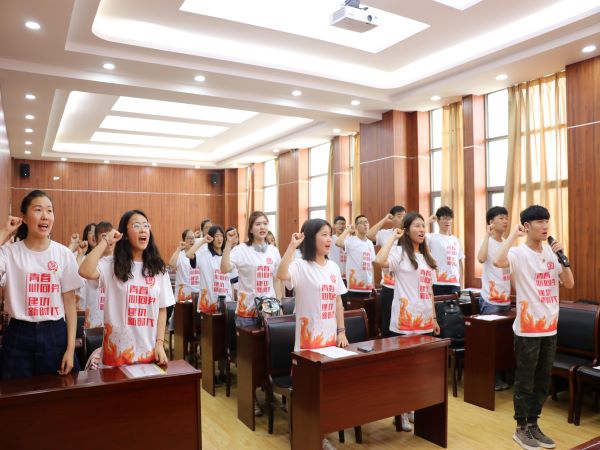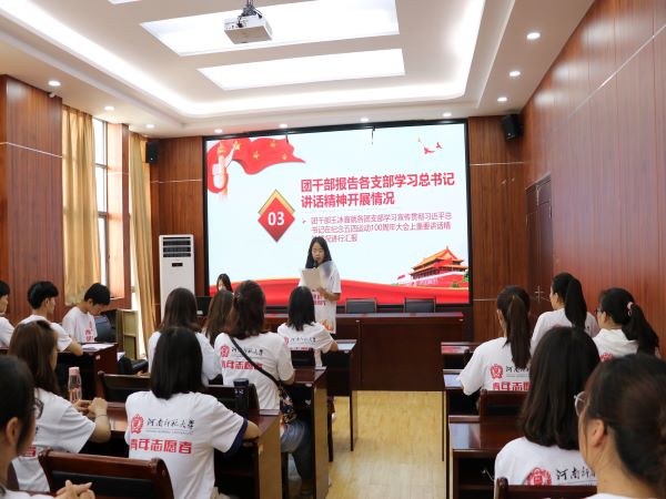 活动伊始,全场观看了习近平总书记在纪念五四运动100周年大会上的重要讲话的相关视频,每位团员仔细聆听了习近平总书记对青年人的寄语,将肩负自己时代使命,争做时代新人的要求牢记于心。团委书记马淑明老师带领青年团员一起学习宣传贯彻习近平总书记在纪念五四运动100周年大会上重要讲话精神。她提出,同学们要在学习中提高内在素质,勇担时代神圣使命,继续加强对五四精神的学习,始终与时俱进,务实创新;同时强调,要将习近平总书记在纪念五四运动100周年大会上重要讲话精神贯彻落实到各个团支部,引导青年学生听党话,跟党走,积极投身中国特色社会主义实践活动。2018级年级团支书就各团支部学习宣传贯彻习近平总书记在纪念五四运动100周年大会上重要讲话精神情况进行汇报,对基层团组织的实践活动进行了总结。优秀团员代表带领现场团员集体宣誓,让同学们深刻认识到自己身上的责任,并鼓励大家将五四精神继承并发扬到生活的方方面面,争做时代带头人,积极踊跃的投入到社会主义核心价值观的建设发展中去。