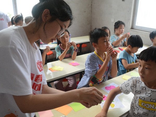 当天下午,实践调研团队员们准时到达村镇小学。队员们将提前准备好的折纸材料分发给孩子们,为调动大家的积极性,队员鼓励孩子们发挥想象,先用卡纸折出自己喜欢的东西。在教如何折纸的过程中,每个孩子都全神贯注聆听,时而埋头苦想,时而举手询问,对折纸展现了极大的热情。由于折纸步骤繁琐,队员们鼓励大家相互协作,分工完成折纸任务。在大家认真折纸的过程中,实践队员们在下面对孩子们进行耐心细致的指导,在孩子们的努力和实践队员的帮助下,孩子们很快完成了自己的作品。临近下课,孩子们纷纷展示了自己努力的成果,调研团队员们将事先折好的纸青蛙作为奖励送给了他们,孩子们也纷纷表示自己要学习折纸,还要把做好的折纸送给队员们。