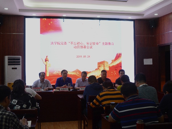 9月24日下午,法学院党委在崇法楼301开展“不忘初心、牢记使命”主题教育动员会议,学院领导班子成员、全体教职工党员以及学生党员代表参加会议。会议由院长王鹏祥主持。