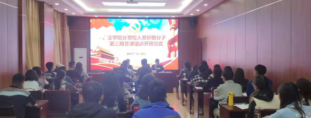 根据校党委的统一部署,法学院分党校第三期入党积极培训班开班仪式于2019年11月3日在崇法楼301会议室举行。院党委书记任永利、组织员赵东方,以及50名入党积极分子参加了开班仪式。