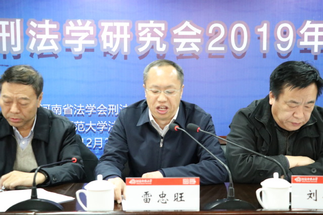 12月29日,河南省法学会刑法学研究会2019年年会在我校勤政楼召开,本次会议由河南省法学会刑法学研究会主办、我校法学院承办,围绕“扫黑除恶、正当防卫、职务犯罪”等热点难点问题进行研讨。河南省政法委副巡视员、河南省法学会党组成员、秘书长雷忠旺,河南省高级人民法院党组副书记、常务副院长、研究会会长王树茂,河南师范大学党委常委、副校长马治军出席会议并讲话,研究会副会长、常务理事、理事及我校师生代表共计160人参加会议。