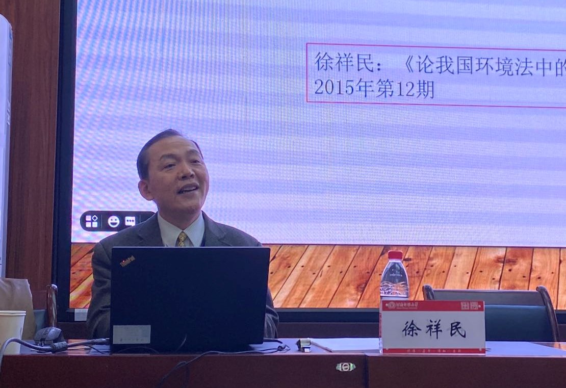讲座伊始,胡光老师隆重介绍了徐祥民教授,并对其莅临表示热烈欢迎。徐祥民教授以三江源为例引出习近平整体环境观,从环境的整体性与有限性、整体环境观对自我中心环境观的超越、环境的绝对有限性与相对有限性等方面进一步加以阐述。随后,徐老师在详细解读环境单元、环境总行为、人天关系、环境共同体的基础上,提出了在环境法学知识体系建设上需要注意的若干问题。最后,徐祥民教授从立法目的、普遍责任原则、总行为控制制度、环保合作制度四个角度,对环境法建设提出独特见解。整场讲座主题鲜明,内容丰富,气氛活跃,掌声不断。