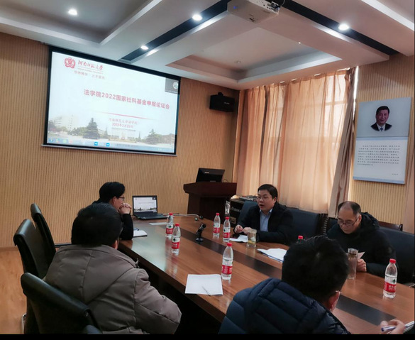 2月23日上午,学院在303会议室召开2022年度国家社科基金申报论证会。会议邀请了中南大学法学院彭中礼院长、四川大学博士生导师周伟教授、中南财经政法大学李长健教授、河南财经政法大学经济法学院陈晓景院长担任本次论证专家,进行线上指导。会议由学院副院长郭少飞主持,申报教师参会并发言。