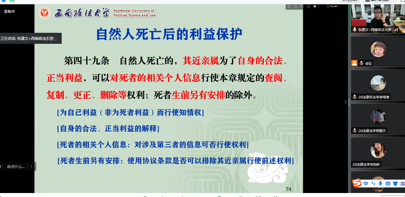 5月12日晚上,应法学院邀请,西南政法大学博士生导师张建文教授在腾讯会议平台作题为《个人信息保护法》的学术讲座。学院相关研究方向青年教师、本科生、研究生90余人参加了此次线上讲座。讲座由法学院副院长郭少飞主持。