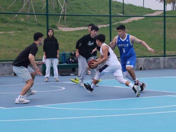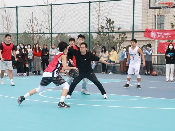 本次篮球赛由2022级新生与学长们进行对决,双方队员锐意进取、斗志昂扬,比分交替上升,僵持不下,充分展示出高超的技术和优秀的团队协作能力。赛场上同学们的加油助威声此起彼伏,为队员们送上支持与鼓励,现场气氛不断攀升。在第二节比赛中,张壬和观赛教师也加入了比赛,将全场气氛推向了高潮,引来阵阵欢呼。赛后,张壬与新生队员们亲切交流,鼓励他们在课余时间多运动,强健体魄,不断充实与丰富大学生活,活动在温馨友好的氛围中落下帷幕。
