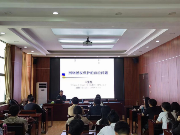 5月12日上午9点30分,华东政法大学博士生导师丛立先教授应邀在法学院301作题为“网络版权保护的前沿问题”的讲座。本次讲座由法学院副院长胡光主持,法学院百余名师生参加。