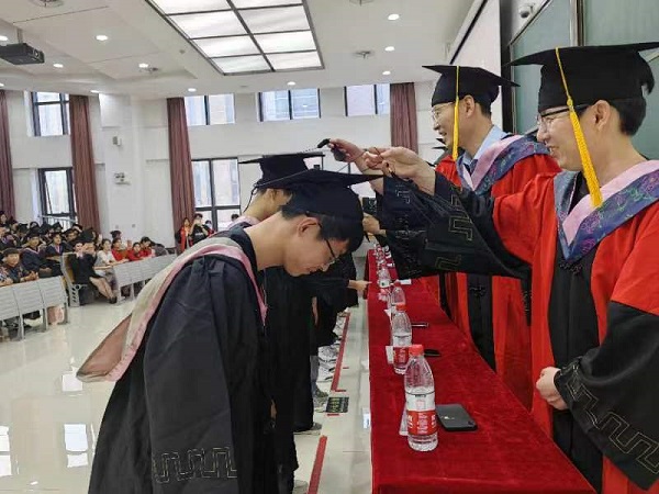 学院党委书记张壬与学院毕业生互赠礼物,为全体毕业生送上祝福。随后,全体领导老师为在场毕业生拨苏正冠,一一进行合影留念。伴随着熟悉的校歌和热烈的掌声响起,毕业生代表上台敬赠鲜花,表达最诚挚的谢意,为毕业典礼画上圆满的句号。