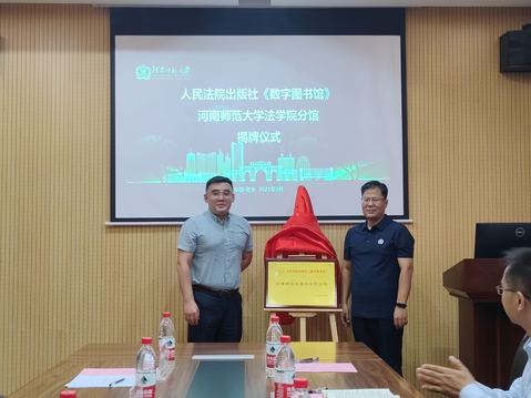 9月23日下午,“人民法院出版社《数字图书馆》河南师范大学法学院分馆揭牌仪式”在法学院303会议室举行。法学院党委书记张壬、院长于庆生以及人民法院电子音像出版社运营中心副主任李昂,人民法院电子音像出版社教育事业线主管宋梦楠一行三人参加了仪式,仪式由法学院副院长胡光主持。
