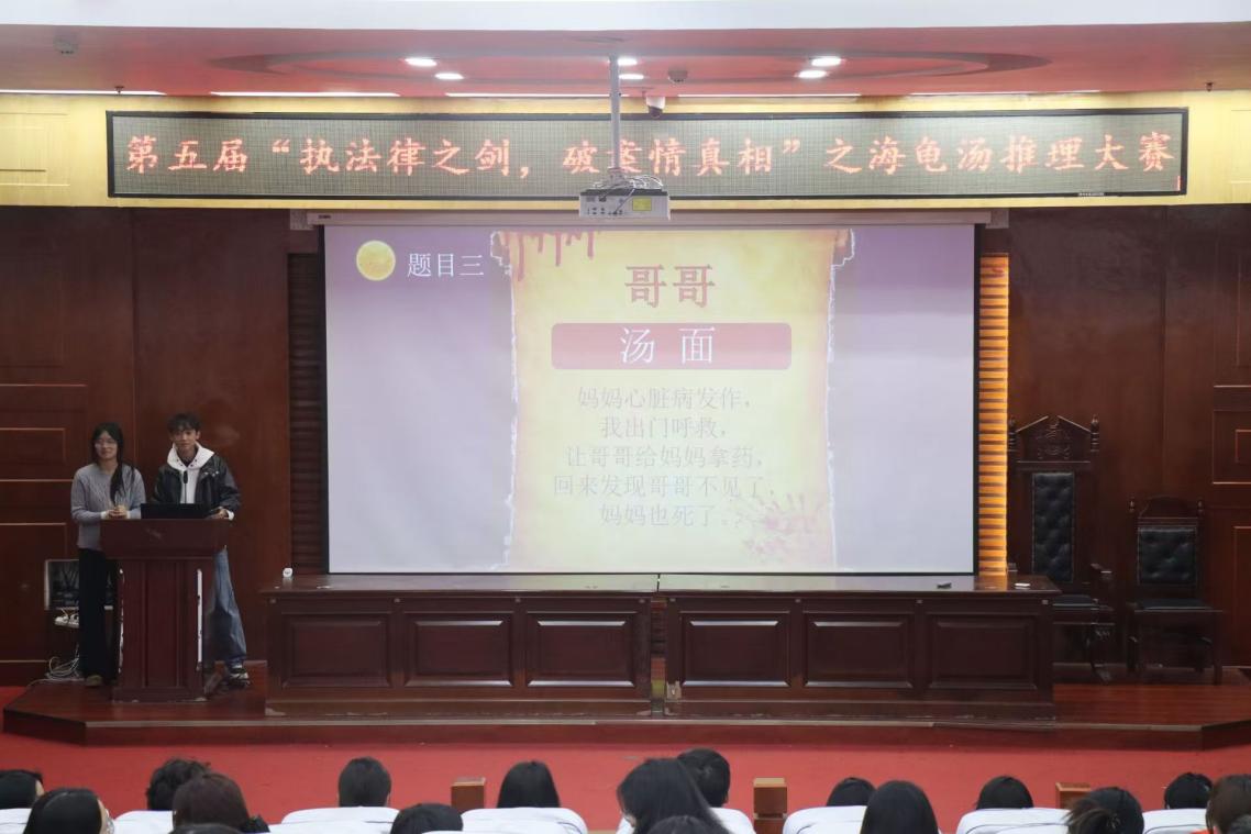 10月25日,“执法律之剑,破案件真相”为主题的“海龟汤”推理大赛由河南师范大学法学院在模拟法庭举办。这一大赛旨在通过趣味推理形式传播法律知识,锻炼同学们的思辨能力和细节分析能力,营造温馨思辨的交流氛围、舒缓学业压力、拓展认知视野,让同学们在校园谱写更加充实欢乐的青春篇章。
