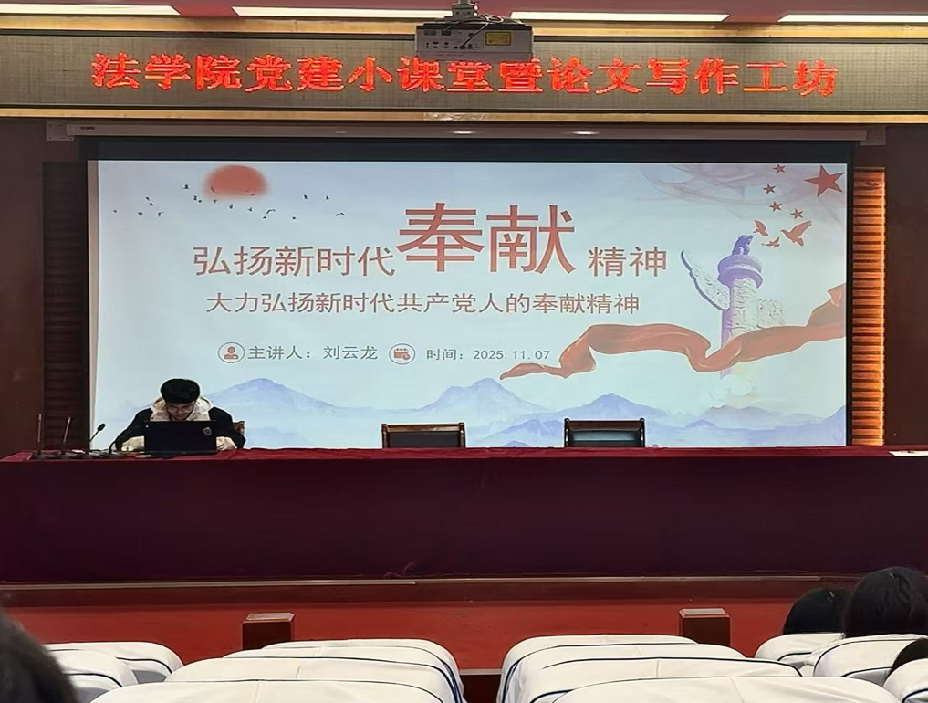 11月7日下午,法学院研究生党支部“党建小课堂”第四十四讲如期开讲。2024级王倩雯同学以《新时代思想领航:习近平新时代中国特色社会主义思想概览》为题、2025级刘云龙同学以《大力弘扬新时代共产党人的奉献精神》为题展开精彩分享,为在场同学带来一堂深刻的思想教育课。