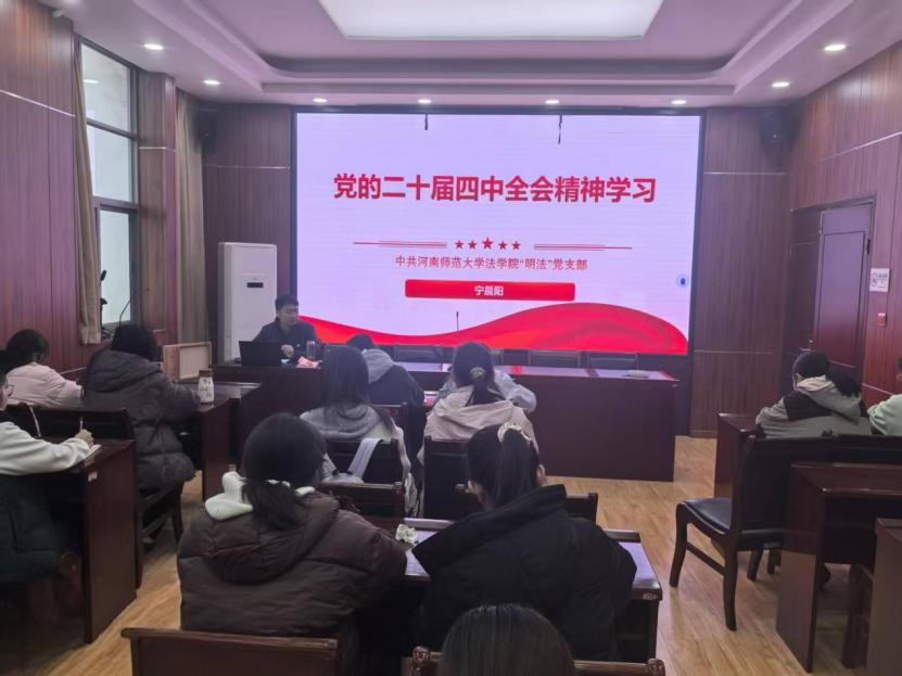 为深入学习贯彻党的二十届四中全会精神,11月25日下午,法学院“明法”党支部开展专题学习会。本次学习由支部书记宁晨阳主讲,支部内推优人员、积极分子与各班团员代表参加学习会。