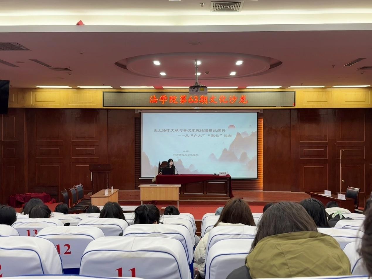 2025年12月18日,法学院研究生会在模拟法庭举办第63期研究生学术沙龙,徐桐博士以“出土法律文献与秦汉家庭治理模式探析”为主讲,2024、2025级研究生参与活动。