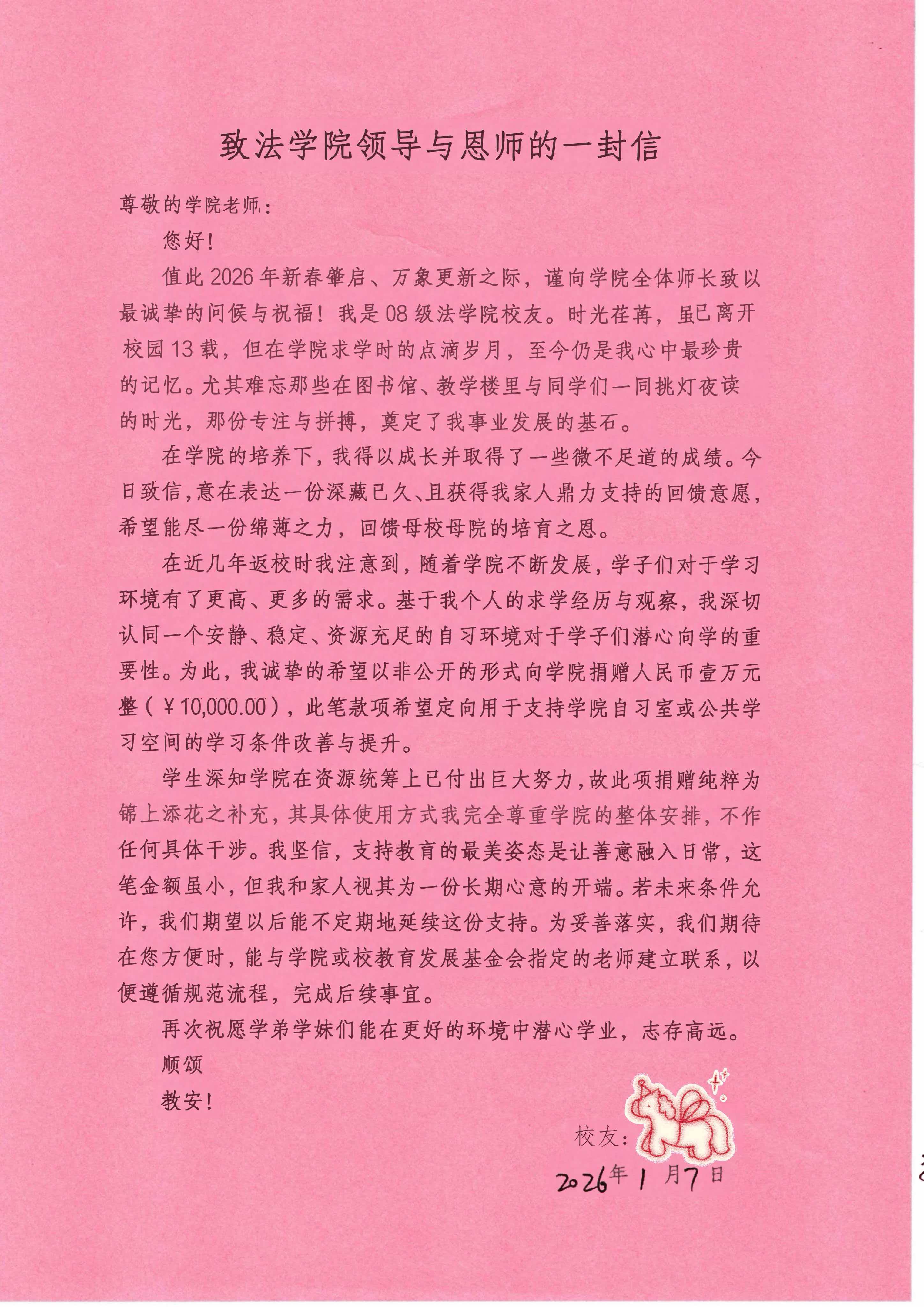 近日,法学院2008级一名校友(根据本人要求,不公开姓名身份)向学院定向捐赠壹万元人民币,用于学院自习室及公共学习空间的条件改善与提升,以实际行动反哺母校教育事业,为学弟学妹们创造更优质的学习环境。