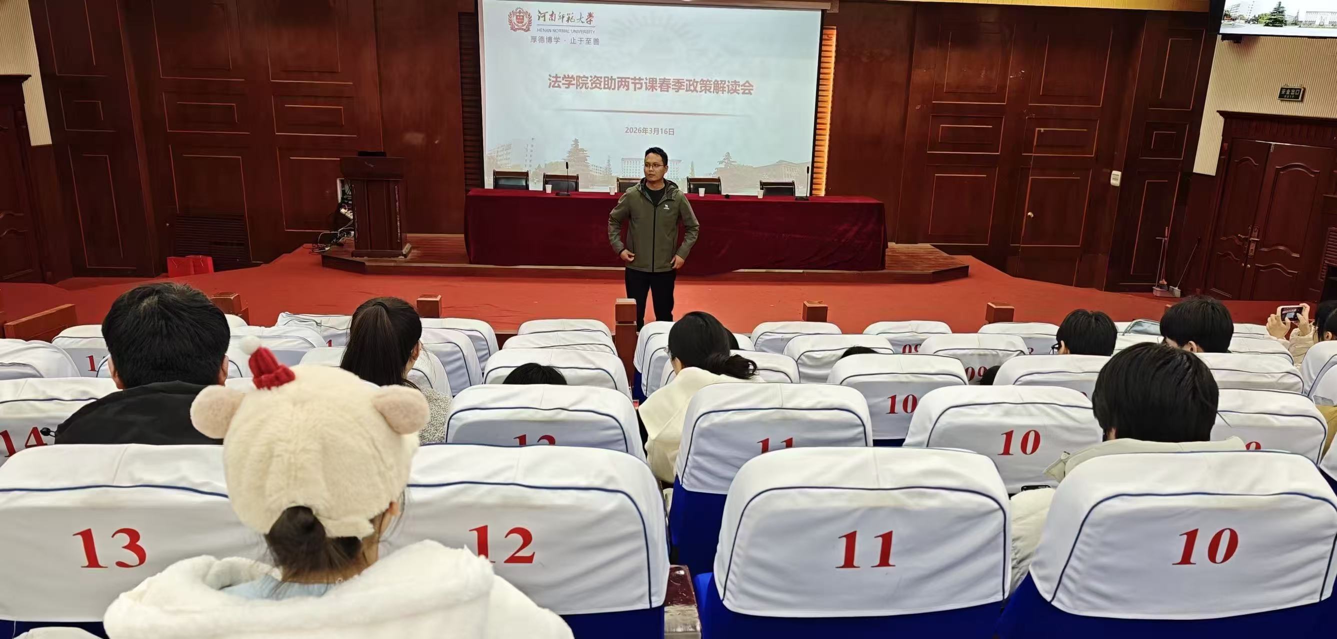 为精准落实国家学生资助政策,推动资助育人与法治教育深度融合,3月16日下午,河南师范大学法学院于模拟法庭举办2026年春季学期资助政策“两节课”解读会。学院党委副书记史春花、全体辅导员及各年级学生代表参会。