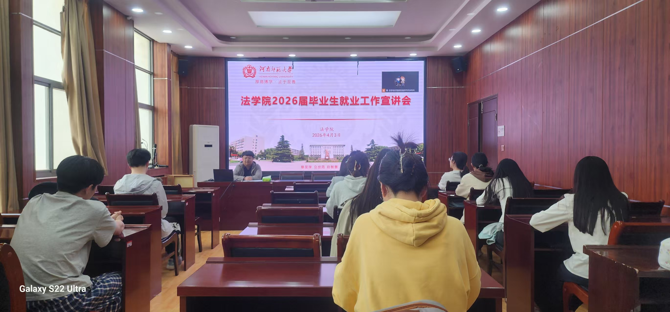 为深入贯彻落实我校毕业生就业工作的部署要求,全面响应教育部关于促进高校毕业生高质量充分就业的工作号召,全力推动2026届毕业生就业工作提质增效。4月3日,法学院在崇法楼301会议室召开2026届毕业生就业工作宣讲会,会议同步开设线上直播通道,实现线下线上全覆盖。本次宣讲会特邀学校招生就业处贾淇涛老师作专题讲座,全体毕业生参加此次活动。