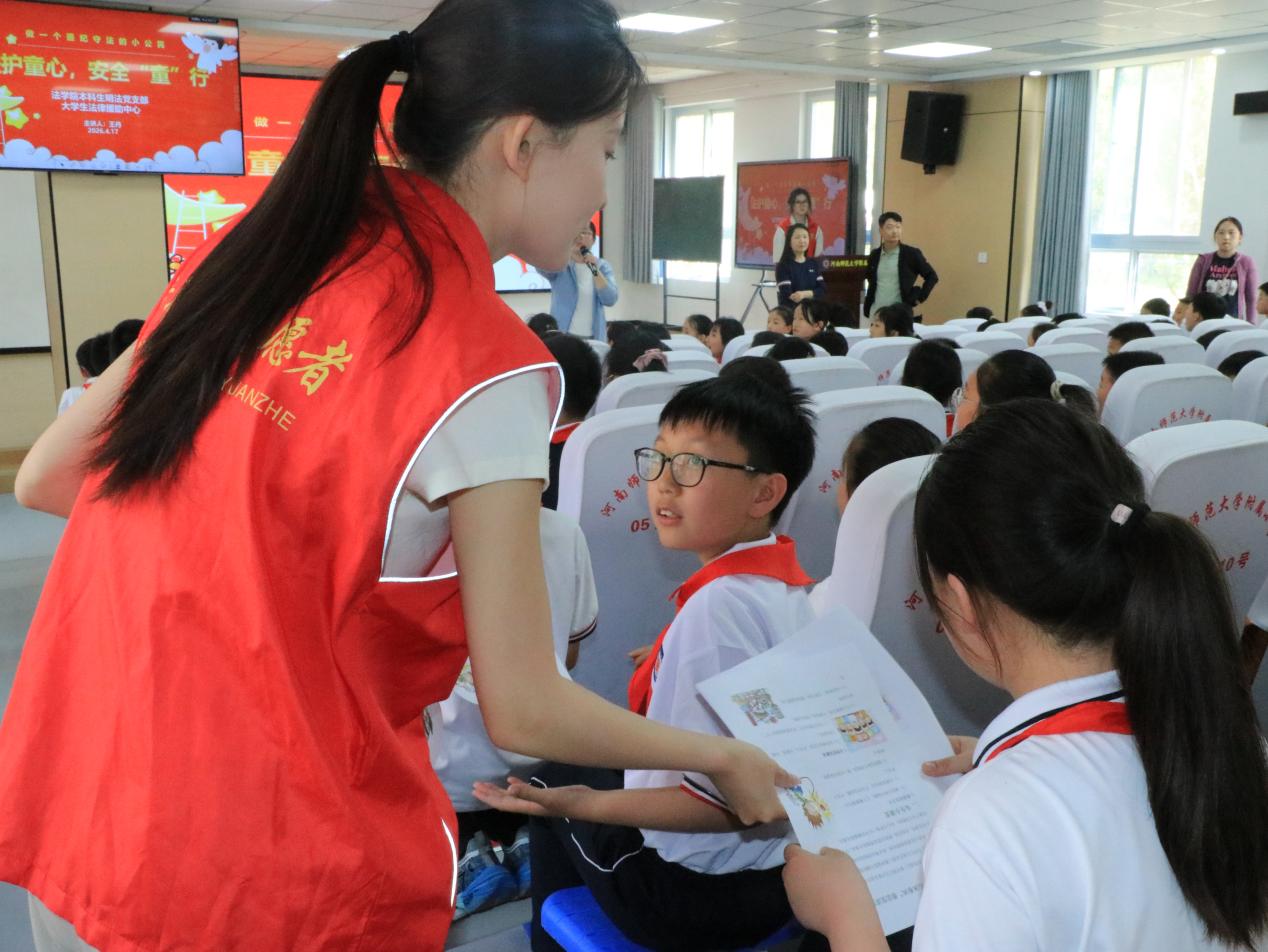 活动中,志愿者先是给参与学生每人发放安全知识宣传页,随后,以生动易懂的表述,带领孩子们走近趣味普法课堂。课堂围绕校园安全、公共安全、网络安全三大板块展开,结合踩踏、交通、消防、防拐骗等真实案例,讲解日常安全风险与防范技巧,引导孩子们养成课间文明休息、出行遵守规则、公共场所礼让有序、遇事冷静求助的良好习惯。