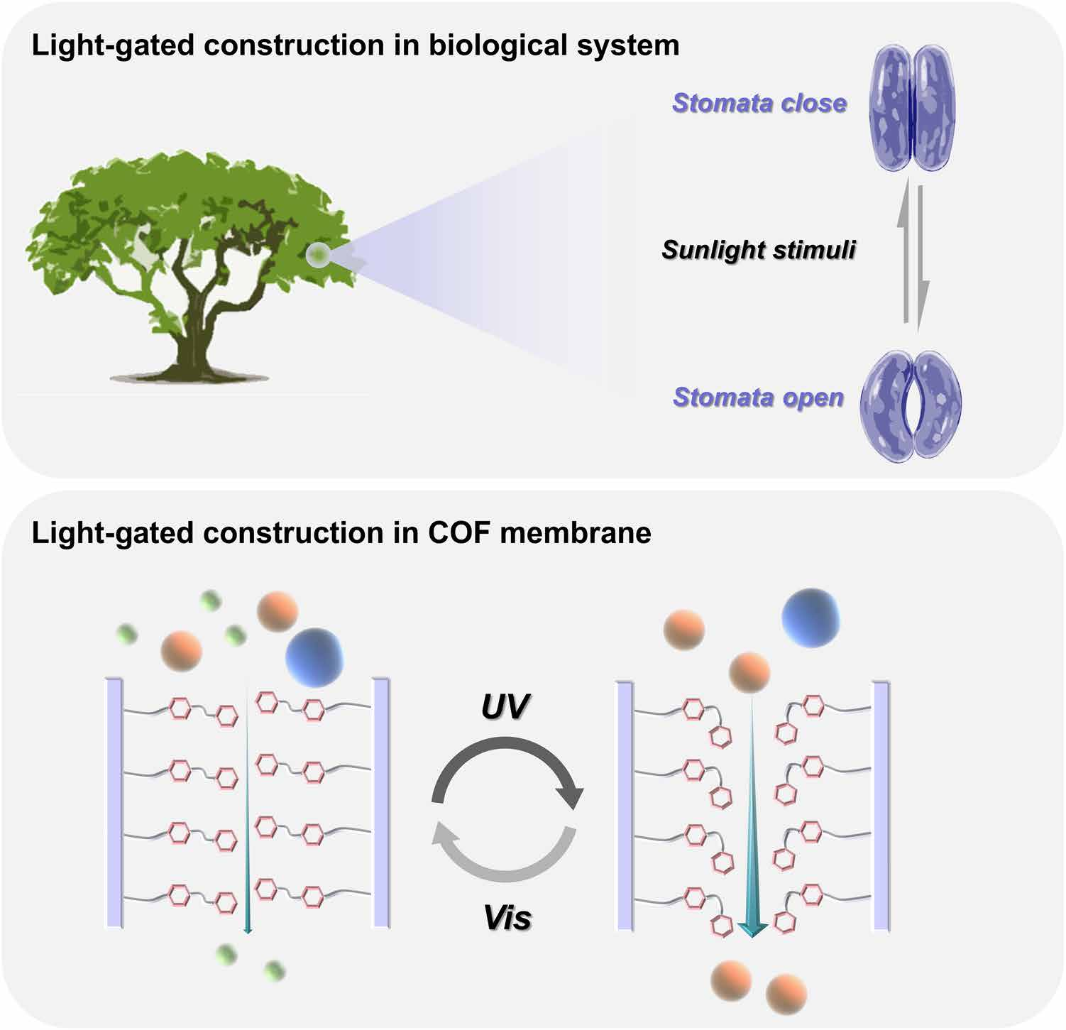膜分离具有能耗低、碳排放低和环境安全性高等显著优势,是化学化工领域分离过程的核心技术。但是,多种分子混合物的分离需串联不同孔径的膜来完成,存在分离效率低,能耗高等问题。如何实现从“多膜分级”到“一膜智控”分离对于减少传统工艺步骤,降低能耗与系统复杂性具有重要意义。自然界中植物气孔的开合可由光进行调控,这为利用光调控膜孔径提供了极佳的灵感。受这一生物现象的启发,本文利用Click反应的高效性,将偶氮苯分子以高达98.5%的接枝效率锚定到共价有机框架(COF)膜的纳米孔道内,成功制备出对光快速响应且稳定的光门控COF膜。得益于其孔径大小可在0.73至0.93 nm间可逆光控切换,该COF膜不仅能原位实现大麻油提取物中大麻二酚油(高价值药品)、柠檬烯和叶绿素的多级分离,还可以精准筛分天然矿石中的金、银和铁等离子。不同于传统的单键锚定方式,本文巧妙性地通过稳定的三唑键将偶氮苯分子固定到框架的孔道内,在经过超100次光控循环和长达12天的连续运行后,其分离性能与晶型结构仍保持稳定,展现出良好的实际应用前景。